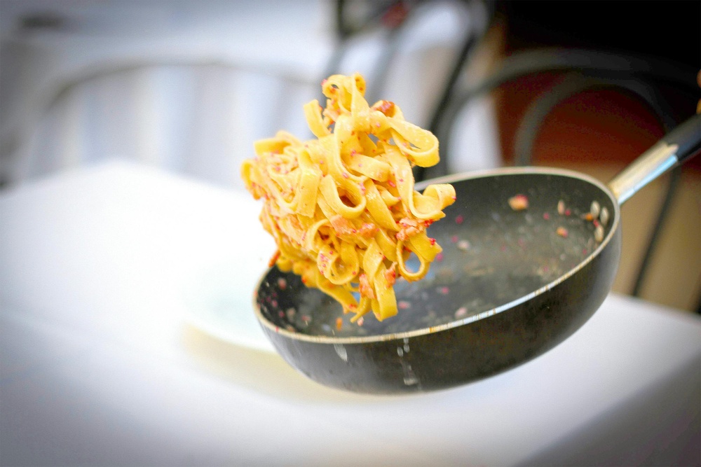 Tagliatelle whit pesto, cherry tomatoes ad black garlic cream (1-3-4-6-7)